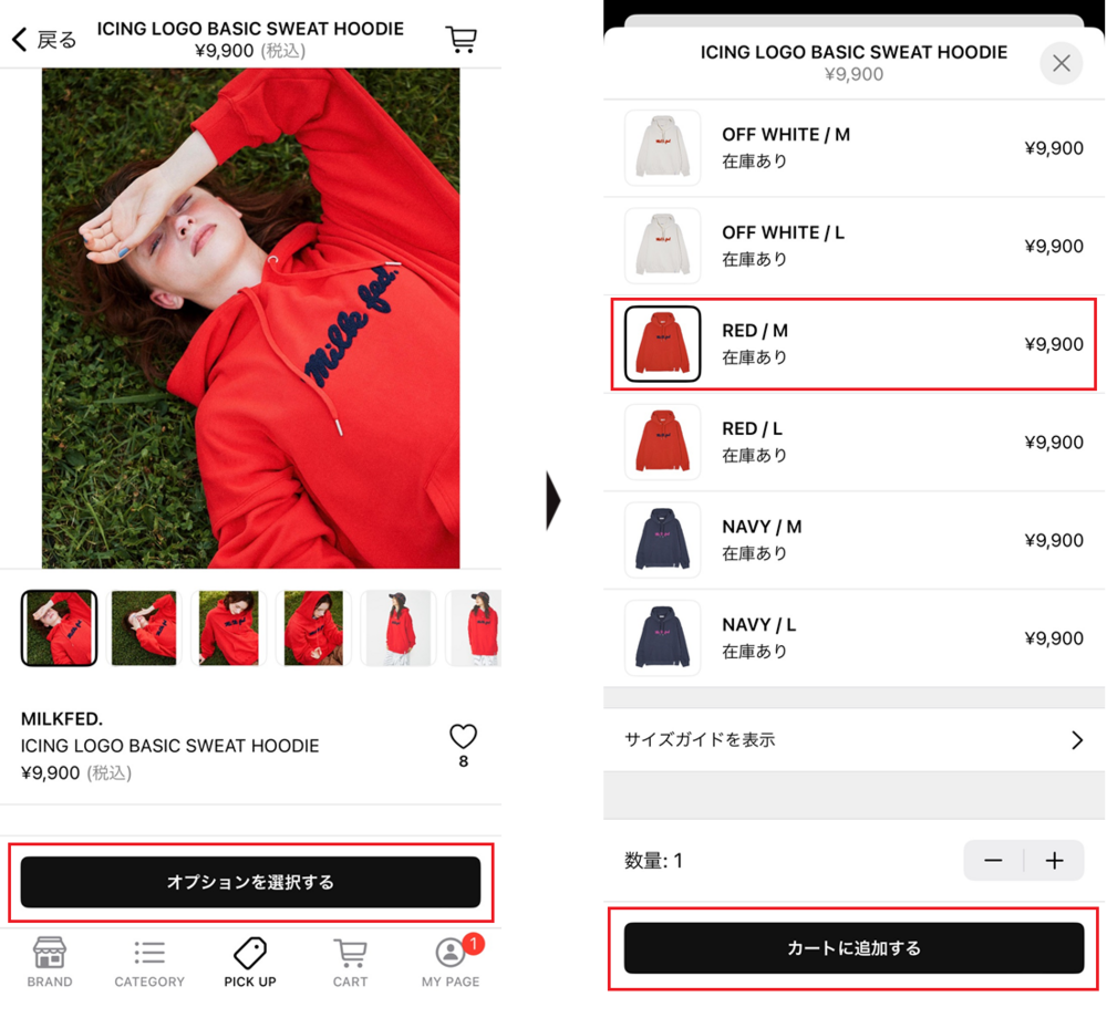 商品ページの「オプションを選択する」からご希望のカラー・サイズをタップし、「カートに追加する」を押してください。