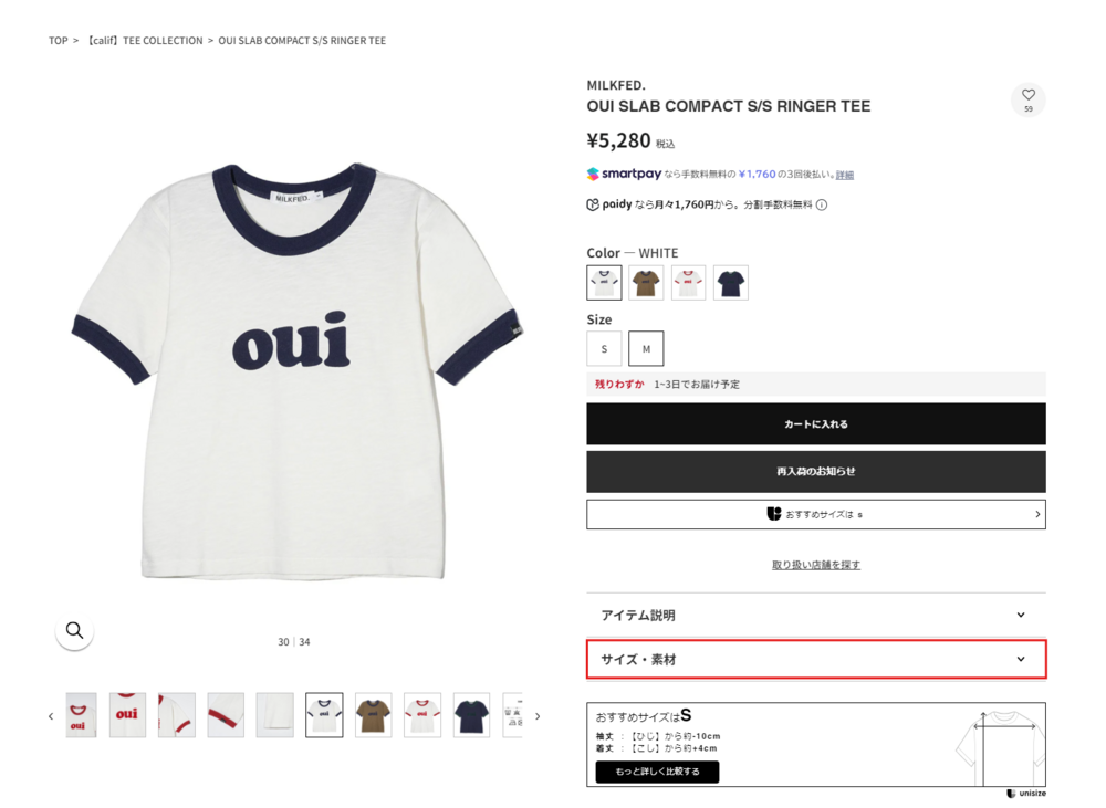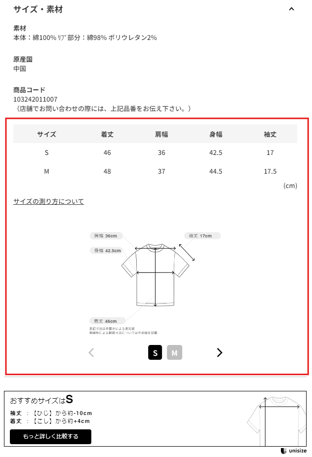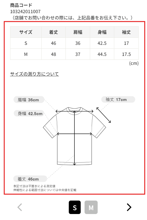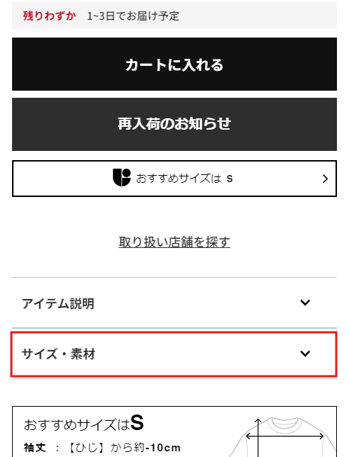 商品ページの「サイズ・素材」に実際の商品を採寸した「実寸」を記載しています。
