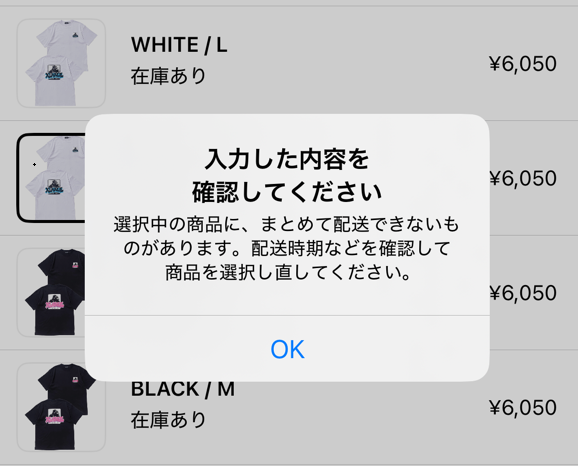 一緒に注文ができない予約商品をカートに入れようとすると、エラーメッセージが表示されます。