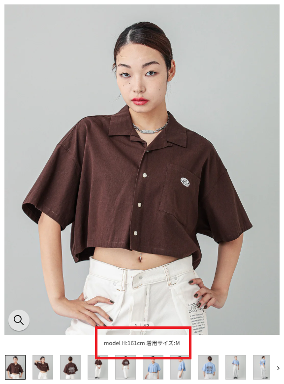 商品ページに掲載しているモデル着用画像より商品のサイズ感や着用イメージを是非ご参考ください。