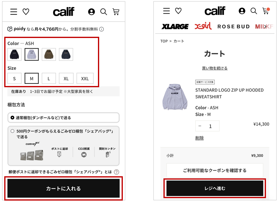 1.商品のカラーバリエーションをご確認の上、ご希望のカラー・サイズを選択し、「カートに入れる」を押下してください。