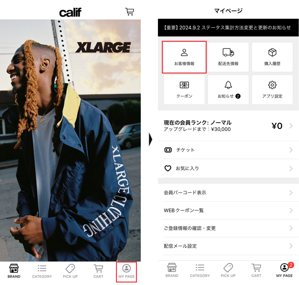 アプリからログイン後、マイページの「お客様情報」をタップしてください。