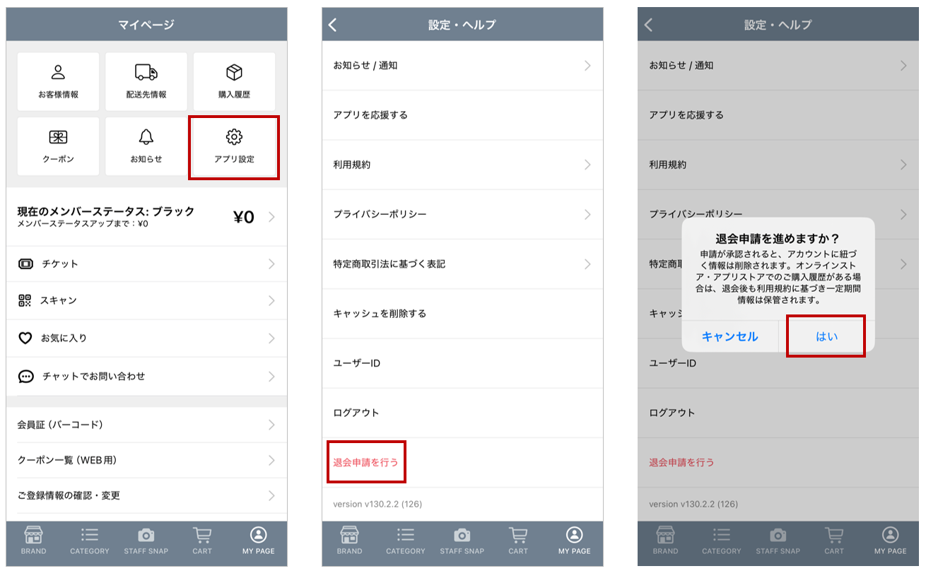 ログイン後、マイページ内「アプリ設定」⇒「退会申請を行う」をタップします。