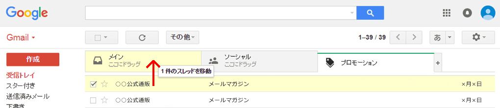 プロモーションタブを開き、メール一覧画面から移動したいメールをドラッグして、メインタブにドラッグ&ドロップします。