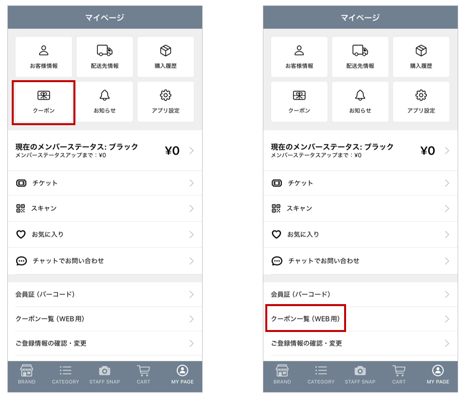 2024年9月1日以前に取得した店舗用クーポンは、アプリ内マイページ下部「クーポン一覧(WEB用)」にてご確認いただけます。